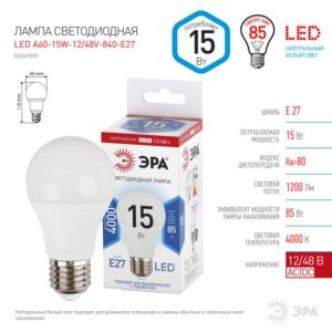 Лампочка светодиодная ЭРА STD LED A60-15W-12/48V-840-E27 E27 / Е27 15Вт груша нейтральный белый свет