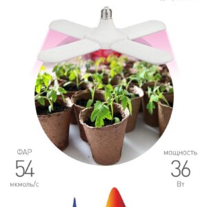 Фитолампа-трансформер Е27 красно-синего спектра мощностью 36 Вт способна осветить несколько квадратных метров рассады с высокой эффективностью. Рекомендованная высота от лампы