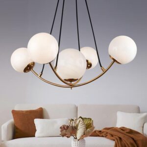 Дизайнерские люстры Rivoli Dina (арт. 4099-305) с 5 круглыми плафонами из матового стекла. В коллекции итальянского бренда Rivoli есть также