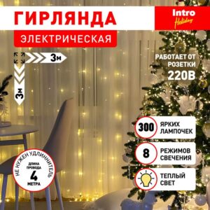 Б0060439 Характеристики Светодиодная новогодняя гирлянда Intro Holiday INZL-01Z занавес 3*3 м теплый белый 300 led 220в: Бренд Intro Внешняя/внутренняя внутренняя