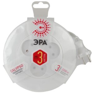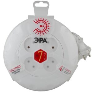 Удлинитель электрический рулетка Эра UR-4-7m-W без заземления, ШВВП, 2×1мм2, 4 розетки, 7 м. Рассчитан на максимальную мощность 10А/2200 Вт. Удлинитель