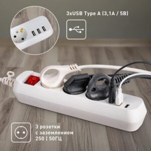Удлинитель электрический ЭРА U-3es-1,5m-USB с заземлением, с выключателем, 3 розетки, 1,5м ПВС 3×0,75мм2. Рассчитан на максимальную мощность 10А/2200Вт. С 3-мя