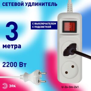 Удлинитель электрический Эра U-2s-3m-2×1 без заземления, с выключателем, ПВС, 2×1мм2, 2 розетки, 3м. Рассчитан на максимальную мощность 10А/2200 Вт. Удлинитель