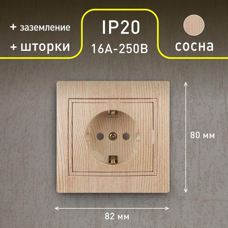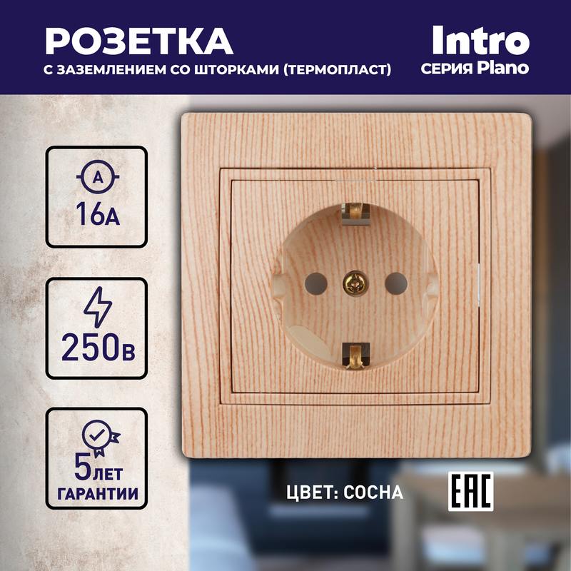 Характеристики 1-206-11 Intro Розетка 2P+E Schuko со шторками, 16А-250В, IP20, СУ, Plano, сосна: