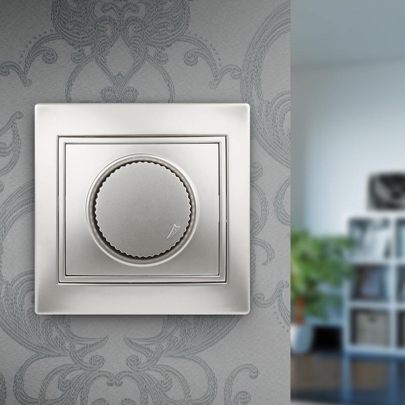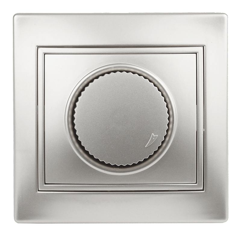 Диммер поворотный серии Intro Plano скрытой установки цвет алюминий 1-401-03. Номинальные характеристики 600ВА 230В . Диммер выполнен из негорючего термопласта, укомплектована одноместной рамкой. Для установки 2-х и более устройств в несколько подрозетников в ряд дополнительно используются многоместные рамки: 2-х постовая — 1-502-хх, 3-х постовая 1-503-хх, 4-х постовая — 1-504-хх (где хх — цветовой код: 01 — белый, 02 — слоновая кость, 03 — алюминий, 04 — шампань, 05 — антрацит, 10 — венге, 11 — сосна).