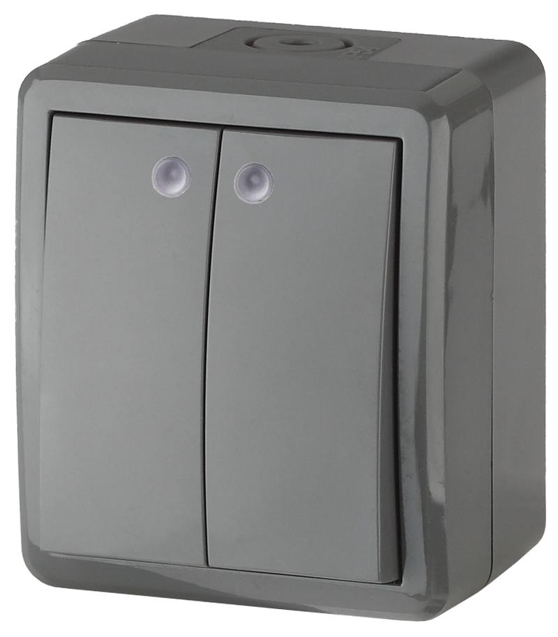 Характеристики 11-1405-03 ЭРА Выключатель двойной с подсветкой IP54, 10АХ-250В, ОУ, Эра Эксперт, серый: