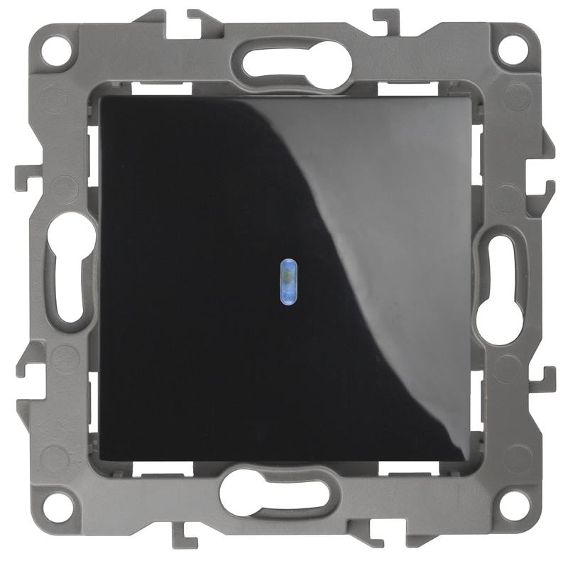 Выключатель 1-клавишный с подсветкой серии Эра 12 скрыт.установки механизм цвет чёрный 12-1102-06. Номинальные характеристики 10А 250В . Сделан из поликарбоната, оснащёно автоматическими клеммами для быстрй и надёжной фиксации жил кабеля в механиме. Парные клеммы обеспечивают соединение шлейфом. Монтаж в подрозетник производится и на лапки, и на винты. Рамки приобретаются отдельно. Рамки Эра 12: 1 пост 12-5001-хх, 2 поста 12-5002-хх, 3 поста 12-5003-хх, 4 поста 12-5004-хх, 5 постов 12-5005-хх. Рамки Эра 12 Сатин: 1 пост 12-5101-хх, 2 поста 12-5102-хх, 3 поста 12-5103-хх, 4 поста 12-5104-хх, 5 постов — 12-5105-хх (хх — код цвета: 01-белый, 02-слоновая кость, 03-алюминий, 04-шампань, 05-антрацит, 06-чёрный, 07-ольха(белёный дуб-сатин), 08-вишня, 09-дуб, 10-венге, 11-сосна, 21-жёлтый, 22-оранжевый, 23-красный, 24-охра, 25-бордо, 26-лайм, 27-зелёный, 28-голубой, 29-синий).