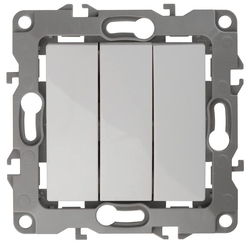 Выключатель 3-клавишный серии Эра 12 скрытой установки механизм цвет белый 12-1107-01. Номинальные характеристики 10А 250В . Сделан из поликарбоната, оснащён винтовыми уникальными клеммами ЭКСПЕРТ для надёжной фиксации жил кабеля в механиме. Парные клеммы обеспечивают соединение шлейфом. Монтаж в подрозетник производится и на лапки, и на винты. Рамки приобретаются отдельно. Рамки Эра 12: 1 пост 12-5001-хх, 2 поста 12-5002-хх, 3 поста 12-5003-хх, 4 поста 12-5004-хх, 5 постов 12-5005-хх. Рамки Эра 12 Сатин: 1 пост 12-5101-хх, 2 поста 12-5102-хх, 3 поста 12-5103-хх, 4 поста 12-5104-хх, 5 постов — 12-5105-хх (хх — код цвета: 01-белый, 02-слоновая кость, 03-алюминий, 04-шампань, 05-антрацит, 06-чёрный, 07-ольха(белёный дуб-сатин), 08-вишня, 09-дуб, 10-венге, 11-сосна, 21-жёлтый, 22-оранжевый, 23-красный, 24-охра, 25-бордо, 26-лайм, 27-зелёный, 28-голубой, 29-синий).