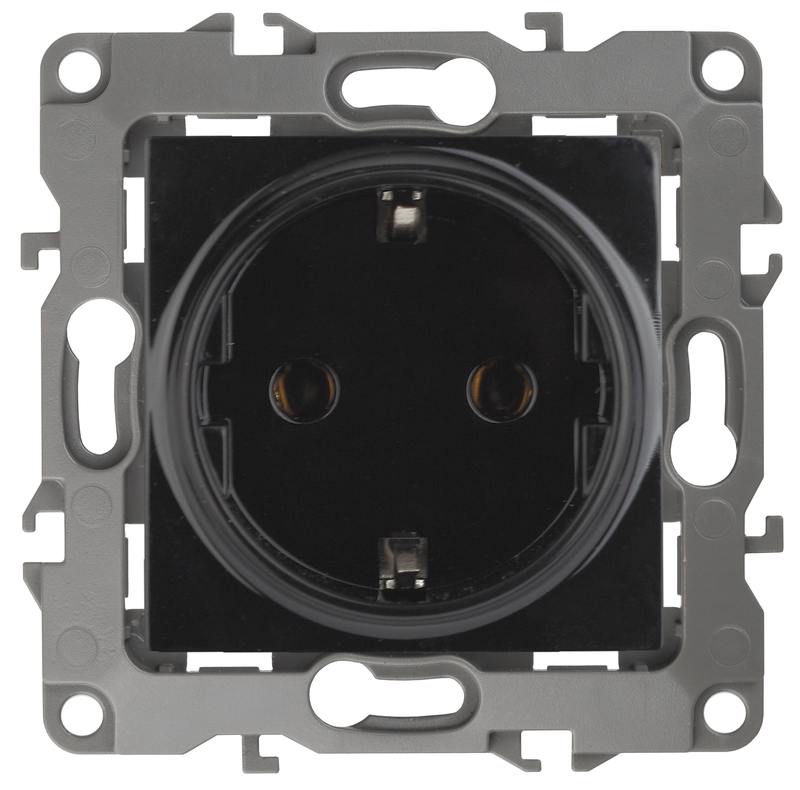 Розетка с заземлением серии Эра 12 скрытой установки механизм цвет чёрный 12-2101-06. Номинальные хар-ки 16А 250В . Сделана из поликарбоната, оснащёна автоматическими клеммами для быстрой и надёжной фиксации жил кабеля в мех аниме. Парные клеммы обеспечивают соединение шлейфом. Монтаж в подрозетник производится и на лапки, и на винты. Рамки приобретаются отдельно. Рамки Эра 12: 1 пост 12-5001-хх, 2 поста 12-5002-хх, 3 поста 12-5003-хх, 4 поста 12-5004-хх, 5 постов 12-5005-хх. Рамки Эра 12 Сатин: 1 пост 12-5101-хх, 2 поста 12-5102-хх, 3 поста 12-5103-хх, 4 поста 12-5104-хх, 5 постов — 12-5105-хх (хх — код цвета: 01-белый, 02-слоновая кость, 03-алюминий, 04-шампань, 05-антрацит, 06-чёрный, 07-ольха(белёный дуб-сатин), 08-вишня, 09-дуб, 10-венге, 11-сосна, 21-жёлтый, 22-оранжевый, 23-красный, 24-охра, 25-бордо, 26-лайм, 27-зелёный, 28-голубой, 29-синий).