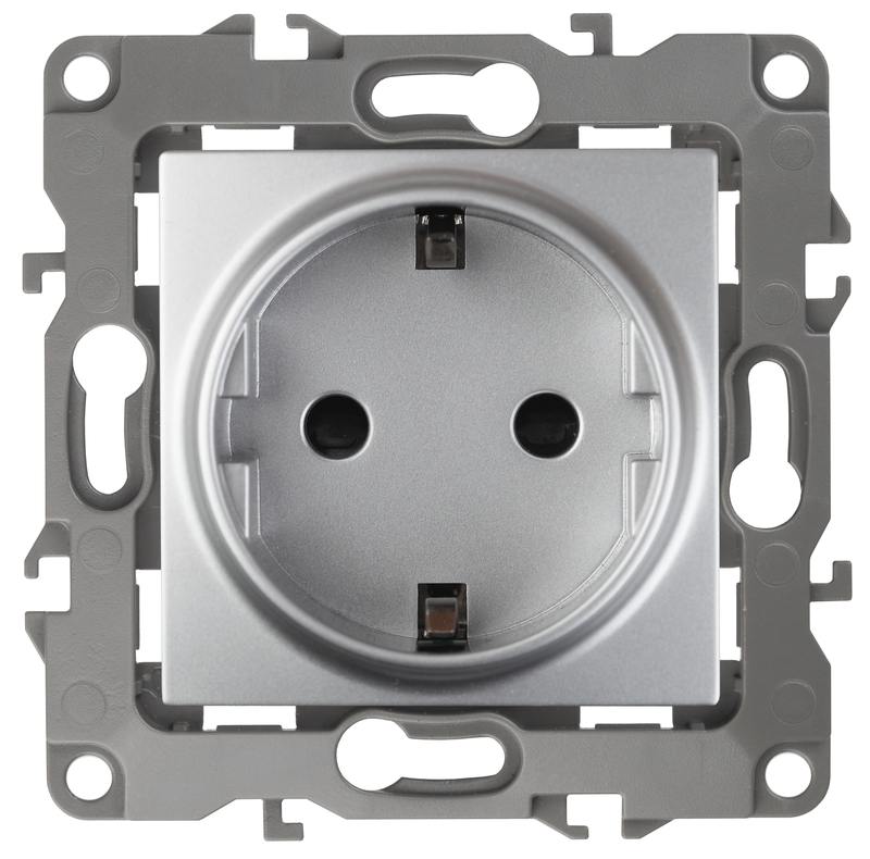 Розетка с заземлением со шторками серии Эра 12 скрытой установки механизм цвет алюминий 12-2102-03. Номинальные хар-ки 16А 250В . Сделана из поликарбоната, оснащёна автоматическими клеммами для быстрй и надёжной фиксации жил кабеля в механиме. Парные клеммы обеспечивают соединение шлейфом. Монтаж в подрозетник производится и на лапки, и на винты. Рамки приобретаются отдельно.