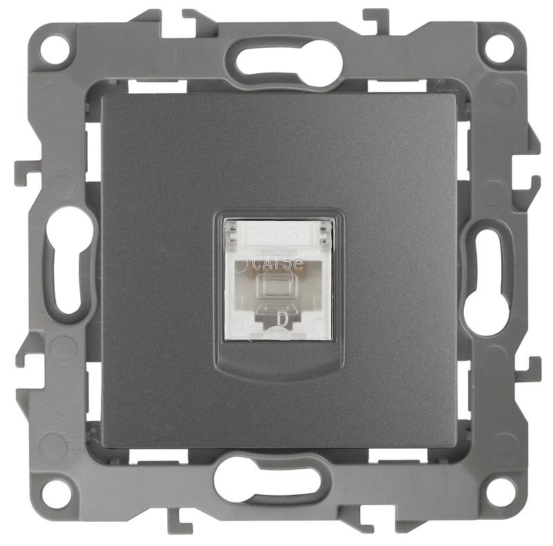 Розетка интернет RJ45 серии Эра 12 скрытой установки механизм цвет графит 12-3107-12. Сделана из поликарбоната. Монтаж в подрозетник производится и на лапки, и на винты. Рамки приобретаются отдельно. Рамки Эра 12: 1 пост 12-5001-хх, 2 поста 12-5002-хх, 3 поста 12-5003-хх, 4 поста 12-5004-хх, 5 постов 12-5005-хх. Рамки Эра 12 Сатин: 1 пост 12-5101-хх, 2 поста 12-5102-хх, 3 поста 12-5103-хх, 4 поста 12-5104-хх, 5 постов — 12-5105-хх (хх — код цвета: 01-белый, 02-слоновая кость, 03-алюминий, 04-шампань, 05-антрацит, 06-чёрный, 07-ольха(белёный дуб-сатин), 08-вишня, 09-дуб, 10-венге, 11-сосна, 21-жёлтый, 22-оранжевый, 23-красный, 24-охра, 25-бордо, 26-лайм, 27-зелёный, 28-голубой, 29-синий).