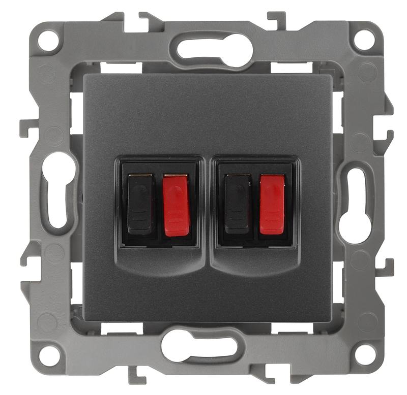 Розетка двойная аудио стерео серии Эра 12 скрытой установки механизм цвет графит 12-3112-12. Сделана из поликарбоната. Монтаж в подрозетник производится и на лапки, и на винты. Рамки приобретаются отдельно. Рамки Эра 12: 1 пост 12-5001-хх, 2 поста 12-5002-хх, 3 поста 12-5003-хх, 4 поста 12-5004-хх, 5 постов 12-5005-хх. Рамки Эра 12 Сатин: 1 пост 12-5101-хх, 2 поста 12-5102-хх, 3 поста 12-5103-хх, 4 поста 12-5104-хх, 5 постов — 12-5105-хх (хх — код цвета: 01-белый, 02-слоновая кость, 03-алюминий, 04-шампань, 05-антрацит, 06-чёрный, 07-ольха(белёный дуб-сатин), 08-вишня, 09-дуб, 10-венге, 11-сосна, 21-жёлтый, 22-оранжевый, 23-красный, 24-охра, 25-бордо, 26-лайм, 27-зелёный, 28-голубой, 29-синий).