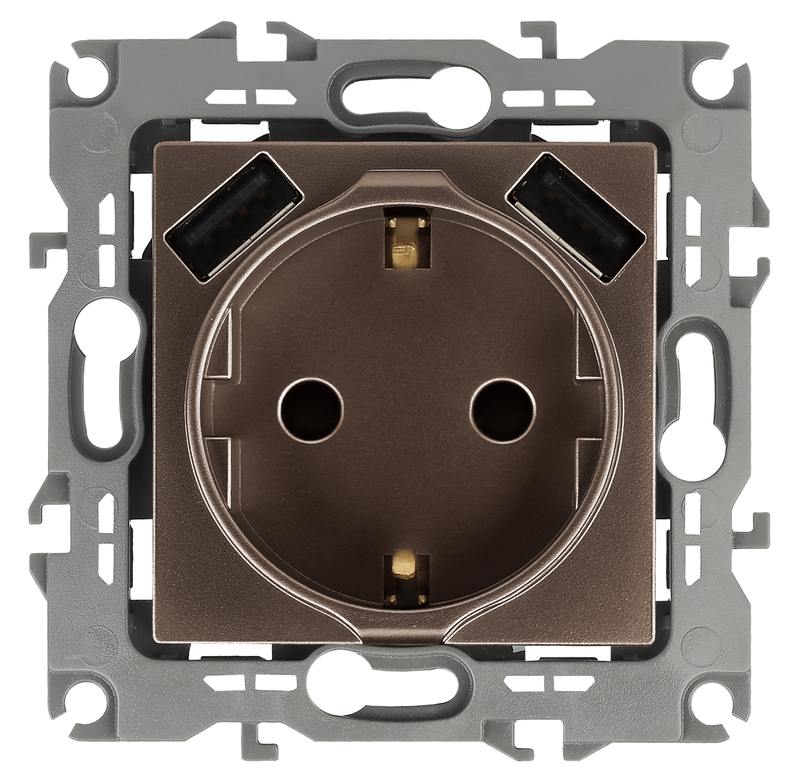 Розетка с заземлением с USB со шторками серии Эра 12 скрытой установки механизм цвет бронза 12-4109-13. Номинальные характеристики 16А 250В/3А-5В . Сделана из поликарбоната. Монтаж в подрозетник производится и на лапки, и на винты. Рамки приобретаются отдельно. Рамки Эра 12: 1 пост 12-5001-хх, 2 поста 12-5002-хх, 3 поста 12-5003-хх, 4 поста 12-5004-хх, 5 постов 12-5005-хх. Рамки Эра 12 Сатин: 1 пост 12-5101-хх, 2 поста 12-5102-хх, 3 поста 12-5103-хх, 4 поста 12-5104-хх, 5 постов — 12-5105-хх (хх — код цвета: 01-белый, 02-слоновая кость, 03-алюминий, 04-шампань, 05-антрацит, 06-чёрный, 07-ольха(белёный дуб-сатин), 08-вишня, 09-дуб, 10-венге, 11-сосна, 21-жёлтый, 22-оранжевый, 23-красный, 24-охра, 25-бордо, 26-лайм, 27-зелёный, 28-голубой, 29-синий).