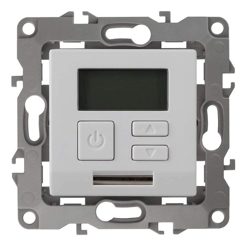 Терморегулятор теплый пол / отопление электронный серии Эра 12 СУ механизм цвет белый 12-4111-01. Номинальные характеристики 16А 230В. Сделана из поликарбоната. Монтаж в подрозетник производится и на лапки, и на винты. Рамки приобретаются отдельно. Рамки Эра 12: 1 пост 12-5001-хх, 2 поста 12-5002-хх, 3 поста 12-5003-хх, 4 поста 12-5004-хх, 5 постов 12-5005-хх. Рамки Эра 12 Сатин: 1 пост 12-5101-хх, 2 поста 12-5102-хх, 3 поста 12-5103-хх, 4 поста 12-5104-хх, 5 постов — 12-5105-хх (хх — код цвета: 01-белый, 02-слоновая кость, 03-алюминий, 04-шампань, 05-антрацит, 06-чёрный, 07-ольха(белёный дуб-сатин), 08-вишня, 09-дуб, 10-венге, 11-сосна, 21-жёлтый, 22-оранжевый, 23-красный, 24-охра, 25-бордо, 26-лайм, 27-зелёный, 28-голубой, 29-синий).