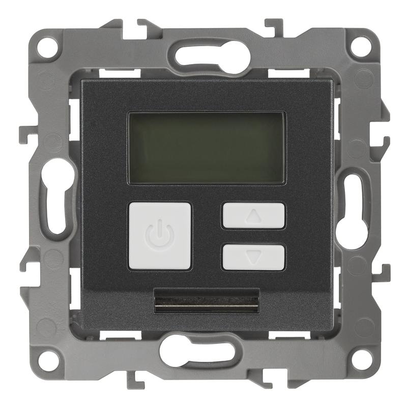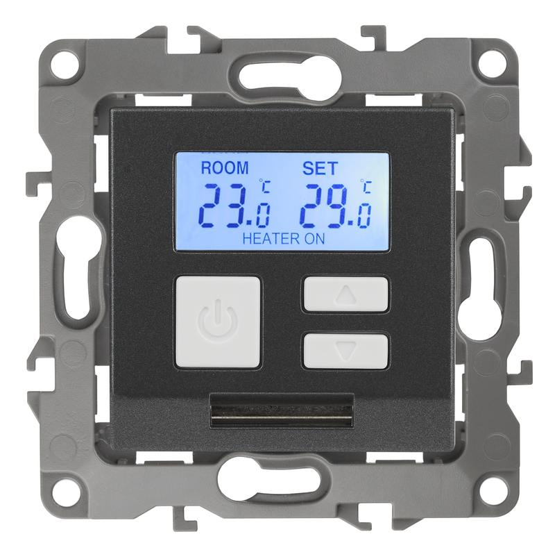 Терморегулятор теплый пол / отопление электронный серии Эра 12 СУ механизм цвет графит 12-4111-12. Номинальные характеристики 16А 230В. Сделана из поликарбоната. Монтаж в подрозетник производится и на лапки, и на винты. Рамки приобретаются отдельно. Рамки Эра 12: 1 пост 12-5001-хх, 2 поста 12-5002-хх, 3 поста 12-5003-хх, 4 поста 12-5004-хх, 5 постов 12-5005-хх. Рамки Эра 12 Сатин: 1 пост 12-5101-хх, 2 поста 12-5102-хх, 3 поста 12-5103-хх, 4 поста 12-5104-хх, 5 постов — 12-5105-хх (хх — код цвета: 01-белый, 02-слоновая кость, 03-алюминий, 04-шампань, 05-антрацит, 06-чёрный, 07-ольха(белёный дуб-сатин), 08-вишня, 09-дуб, 10-венге, 11-сосна, 21-жёлтый, 22-оранжевый, 23-красный, 24-охра, 25-бордо, 26-лайм, 27-зелёный, 28-голубой, 29-синий).