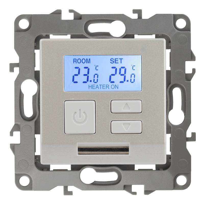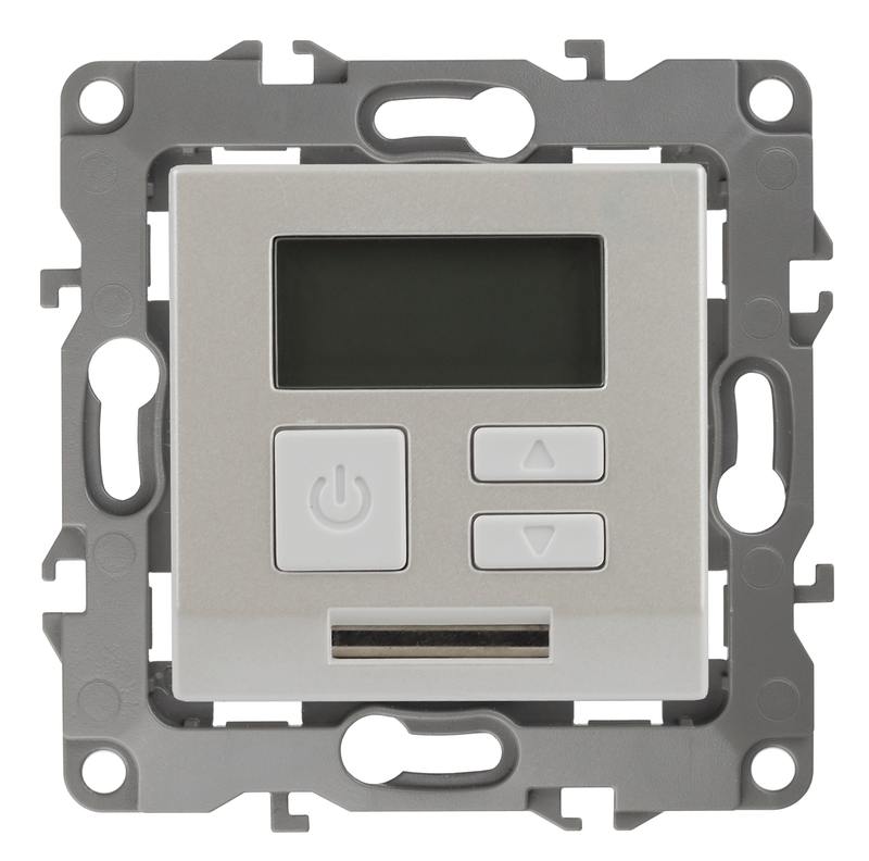 Терморегулятор теплый пол / отопление электронный серии Эра 12 СУ механизм цвет перламутр 12-4111-15. Номинальные характеристики 16А 230В. Сделана из поликарбоната. Монтаж в подрозетник производится и на лапки, и на винты. Рамки приобретаются отдельно. Рамки Эра 12: 1 пост 12-5001-хх, 2 поста 12-5002-хх, 3 поста 12-5003-хх, 4 поста 12-5004-хх, 5 постов 12-5005-хх. Рамки Эра 12 Сатин: 1 пост 12-5101-хх, 2 поста 12-5102-хх, 3 поста 12-5103-хх, 4 поста 12-5104-хх, 5 постов — 12-5105-хх (хх — код цвета: 01-белый, 02-слоновая кость, 03-алюминий, 04-шампань, 05-антрацит, 06-чёрный, 07-ольха(белёный дуб-сатин), 08-вишня, 09-дуб, 10-венге, 11-сосна, 21-жёлтый, 22-оранжевый, 23-красный, 24-охра, 25-бордо, 26-лайм, 27-зелёный, 28-голубой, 29-синий).