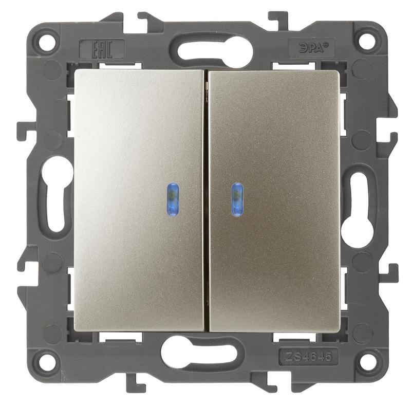 Характеристики 14-1105-04 ЭРА Выключатель двойной с подсветкой, 10АХ-250В, IP20, Эра Elegance, шампань: