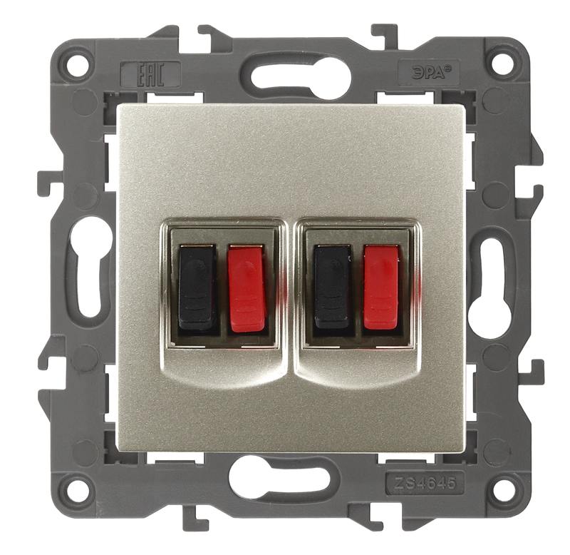 Розетка двойная аудио стерео серии Эра Elegance цвет шампань 14-3112-04. Рамки приобретаются отдельно. Рамки Эра Elegance ПЛАСТИК: 1 пост 14-5001-хх, 2 поста 14-5002-хх, 3 поста 14-5003-хх, 4 поста 14-5004-хх, 5 постов 14-5005-хх; СТЕКЛО: 1 пост 14-5101-хх, 2 поста 14-5102-хх, 3 поста 14-5103-хх, 4 поста 14-5104-хх; МЕТАЛЛ: 1 пост 14-5201-хх, 2 поста 14-5202-хх, 3 поста 14-5203-хх, 4 поста 14-5204-хх; ДЕРЕВО: 1 пост 14-5301-хх, 2 поста 14-5302-хх, 3 поста 14-5303-хх, 4 поста 14-5304-хх (хх — код цвета: 00-прозрачный, 01-белый, белёный дуб, 02-слоновая кость, 03-алюминий, 04-шампань, 05-чёрный, чёрное дерево, 07-ясень, 09-дуб, 10-венге, 11-клён, 14-медь, 21-жёлтый, 22-оранжевый, 23-красный, 25-бордо, 26-лайм, 27-зелёный, 28-голубой, 29-синий, 30-розовый, 31-мокко, 32-серый, 41-сталь, 42-титан).