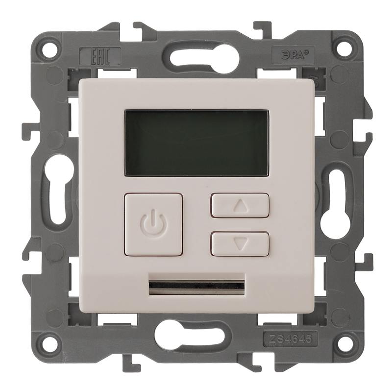 Терморегулятор теплый пол / отопление электронный серии Эра Elegance цвет слоновая кость 14-4111-02. Рамки приобретаются отдельно. Рамки Эра Elegance ПЛАСТИК: 1 пост 14-5001-хх, 2 поста 14-5002-хх, 3 поста 14-5003-хх, 4 поста 14-5004-хх, 5 постов 14-5005-хх; СТЕКЛО: 1 пост 14-5101-хх, 2 поста 14-5102-хх, 3 поста 14-5103-хх, 4 поста 14-5104-хх; МЕТАЛЛ: 1 пост 14-5201-хх, 2 поста 14-5202-хх, 3 поста 14-5203-хх, 4 поста 14-5204-хх; ДЕРЕВО: 1 пост 14-5301-хх, 2 поста 14-5302-хх, 3 поста 14-5303-хх, 4 поста 14-5304-хх (хх — код цвета: 00-прозрачный, 01-белый, белёный дуб, 02-слоновая кость, 03-алюминий, 04-шампань, 05-чёрный, чёрное дерево, 07-ясень, 09-дуб, 10-венге, 11-клён, 14-медь, 21-жёлтый, 22-оранжевый, 23-красный, 25-бордо, 26-лайм, 27-зелёный, 28-голубой, 29-синий, 30-розовый, 31-мокко, 32-серый, 41-сталь, 42-титан).