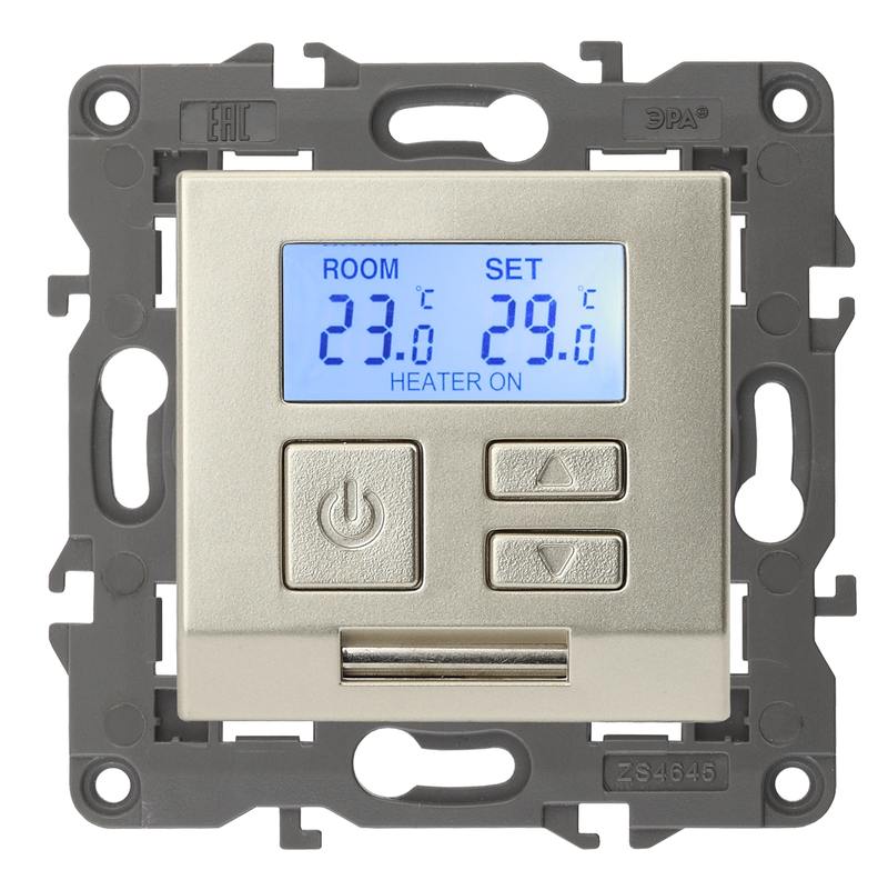Терморегулятор теплый пол / отопление электронный серии Эра Elegance цвет шампань 14-4111-04. Рамки приобретаются отдельно. Рамки Эра Elegance ПЛАСТИК: 1 пост 14-5001-хх, 2 поста 14-5002-хх, 3 поста 14-5003-хх, 4 поста 14-5004-хх, 5 постов 14-5005-хх; СТЕКЛО: 1 пост 14-5101-хх, 2 поста 14-5102-хх, 3 поста 14-5103-хх, 4 поста 14-5104-хх; МЕТАЛЛ: 1 пост 14-5201-хх, 2 поста 14-5202-хх, 3 поста 14-5203-хх, 4 поста 14-5204-хх; ДЕРЕВО: 1 пост 14-5301-хх, 2 поста 14-5302-хх, 3 поста 14-5303-хх, 4 поста 14-5304-хх (хх — код цвета: 00-прозрачный, 01-белый, белёный дуб, 02-слоновая кость, 03-алюминий, 04-шампань, 05-чёрный, чёрное дерево, 07-ясень, 09-дуб, 10-венге, 11-клён, 14-медь, 21-жёлтый, 22-оранжевый, 23-красный, 25-бордо, 26-лайм, 27-зелёный, 28-голубой, 29-синий, 30-розовый, 31-мокко, 32-серый, 41-сталь, 42-титан).