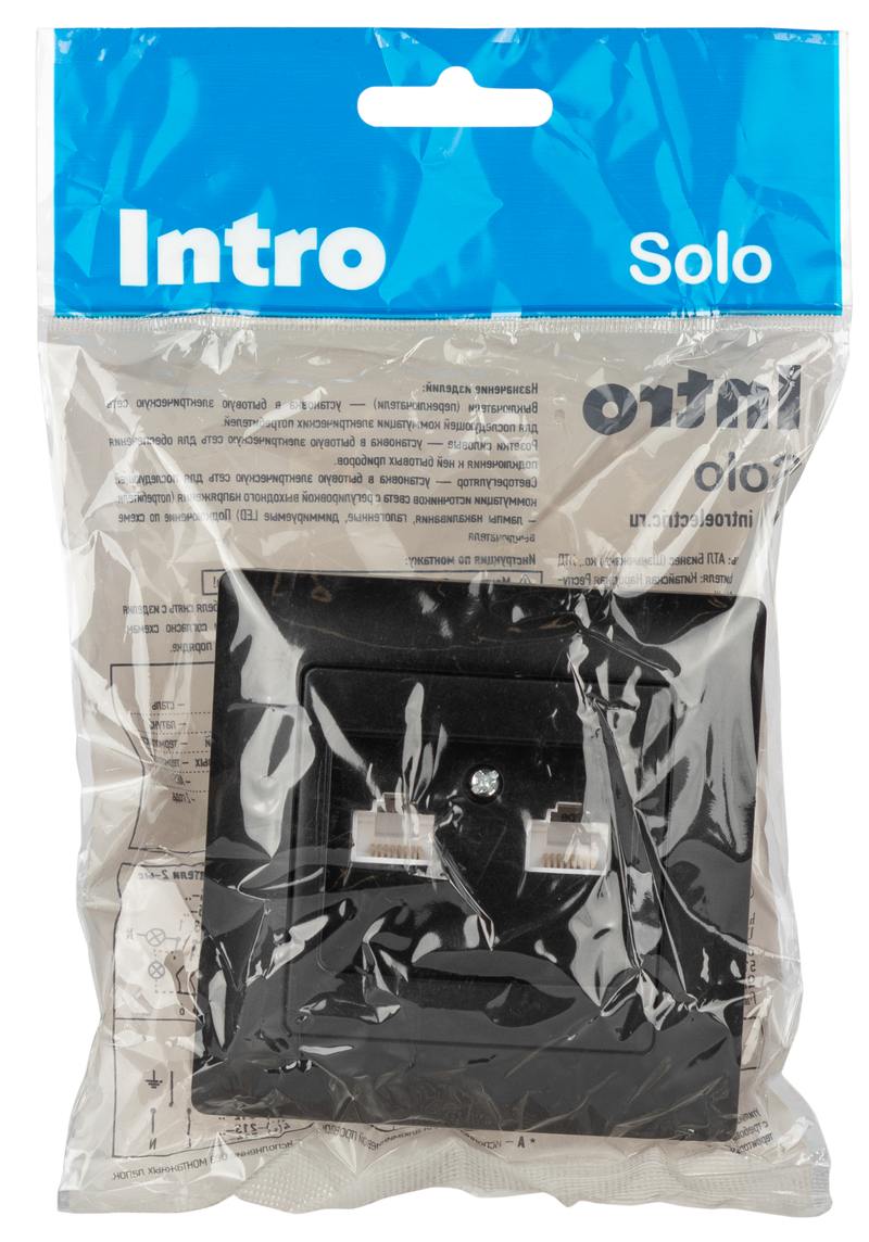 Розетка информационная на два порта 2xRJ45, серии Solo, скрытой установки 4-304-05 цвет антрацит. Выполнена из термопластика, укомплектована одноместной рамкой.