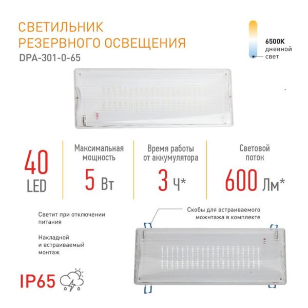 Характеристики Аварийный светильник светодиодный ЭРА DPA-301-0-65 непостоянный 40LED 3ч IP65: