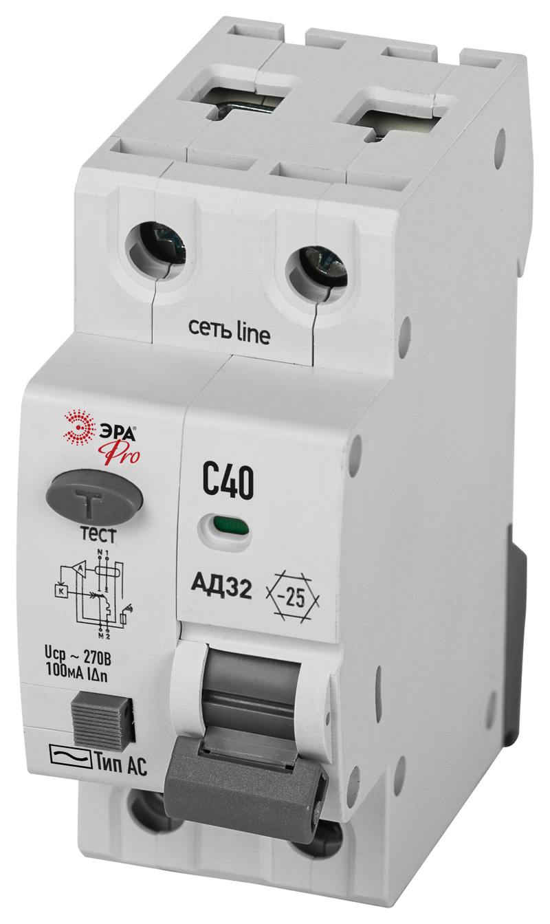 Характеристики АВДТ 4,5кА ЭРА PRO D32E2C40АC100P АД-32 электронное 1P+N C40 100мА тип АC защита 230В: