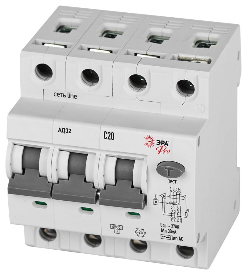 Характеристики АВДТ 4,5кА ЭРА PRO D32E4C20АC30P АД-32 электронное 3P+N C20 30мА тип АC защита 230В: