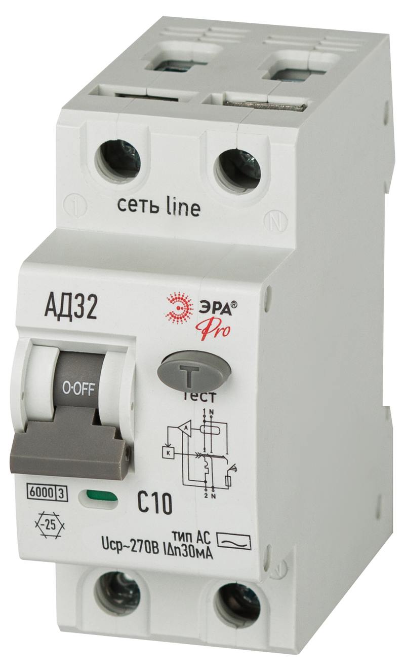 Характеристики АВДТ 6кА ЭРА PRO D326E2C10АC30P АД-32 электронное 1P+N C10 30мА тип АC защита 270В: