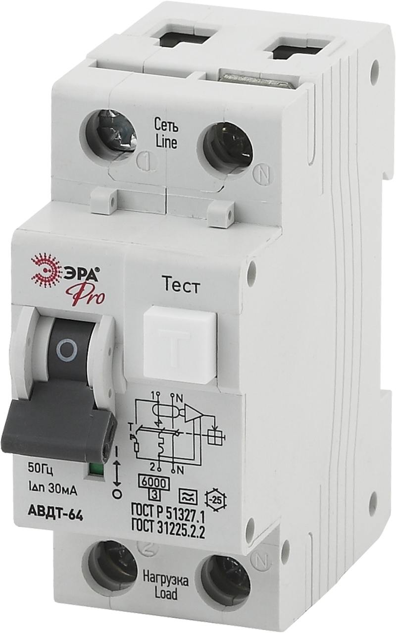Характеристики Автоматический выключатель дифференциального тока ЭРА PRO NO-901-93 АВДТ 64 C20 30мА 1P+N тип A: