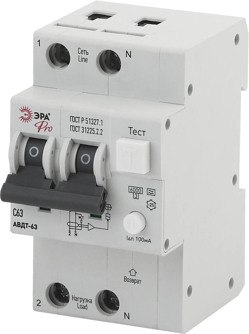 Характеристики Автоматический выключатель дифференциального тока ЭРА PRO NO-901-97 АВДТ 63 C63 100мА 1P+N тип A: