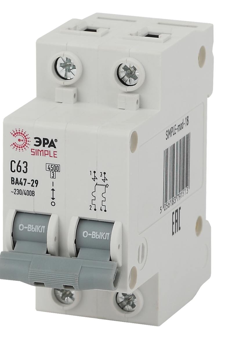 Характеристики Автоматический выключатель ЭРА SIMPLE SIMPLE-mod-18 2P 63А (C) 4,5кА ВА 47-29: