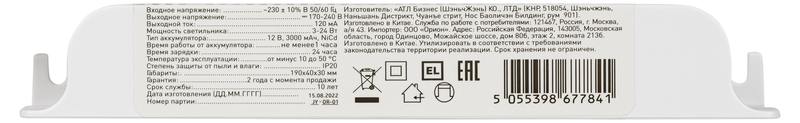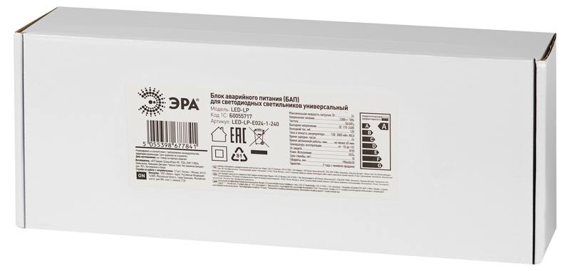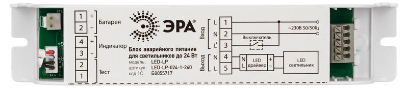 Характеристики БАП для светильников ЭРА LED-LP-E024-1-240 универсальный до 24Вт 1час IP20: