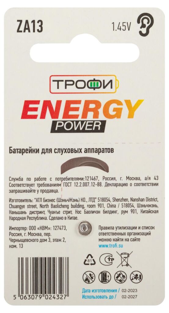 Характеристики Батарейки Трофи ZA13-6BL ENERGY POWER Hearing Aid: