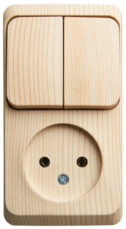 Блок ЭТЮД (сосна, открытой установки) предназначен для применения в сетях до 250В, состоит из розетки на 16А, со шторками, без заземления и двухклавишного выключателя на 10А. Две клавиши позволяют управлять двумя источниками света с одной точки. Он удобен в применении и отлично подходит для коридора. Изделия цвета Сосна обладают уникальным рисунком, напоминающим древесный сруб. Сделано в России.