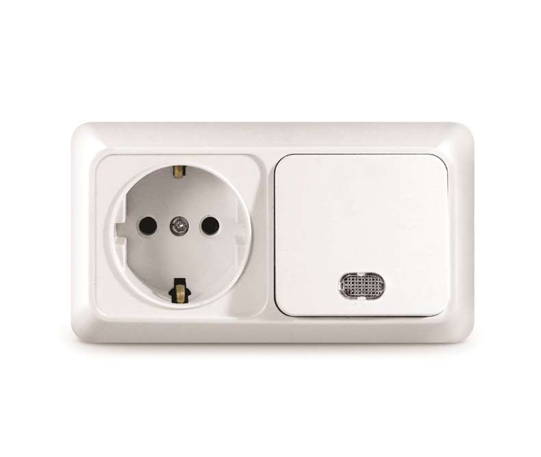 Блок ОП Олимп 1-кл. вык. с подсветкой + роз. с заземл. горизонт. бел. UNIVersal О0036 представлен потребителю в серии «Олимп». Серия «Олимп» для открытой установки сочетает в себе функциональность с практичностью. Изделия данной серии удачно вписываются в интерьер любого помещения и производят приятное впечатление. Блок объединяет одноклавишный выключатель и розетку. Корпус представляет собой форму из пластика, белого цвета. Контактная группа изделий изготовлена из латуни. Монтируется горизонтально, на глубину 48 мм, на поверхность стены. Рекомендованы для жилых помещений и административных зданий. Срок службы составляет 5 000 циклов включения/отключения.