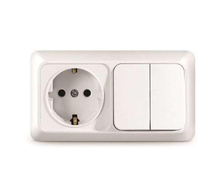 Блок ОП Олимп 2-кл. вык.+ роз. с заземл. горизонт. бел. UNIVersal О0033 представлен потребителю в серии «Олимп». Серия «Олимп» для открытой установки сочетает в себе функциональность с практичностью. Изделия данной серии удачно вписываются в интерьер любого помещения и производят приятное впечатление. Блок объединяет двухклавишный выключатель и розетку. Корпус представляет собой форму из пластика, белого цвета. Контактная группа изделий изготовлена из латуни. Монтируется горизонтально, на глубину 48 мм, на поверхность стены. Рекомендованы для жилых помещений и административных зданий. Срок службы составляет 5 000 циклов включения/отключения.
