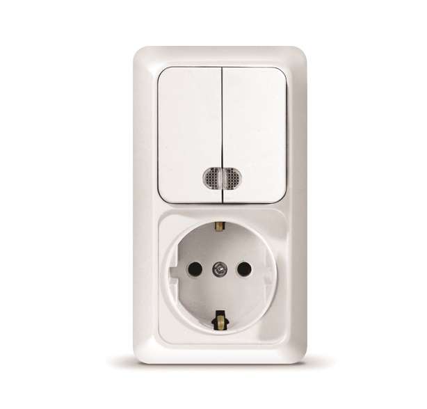 Блок ОП Олимп 2-кл. вык. с подсветкой + роз. с заземл. верт. бел. UNIVersal О0041 представлен потребителю в серии «Олимп». Серия «Олимп» для открытой установки сочетает в себе функциональность с практичностью. Изделия данной серии удачно вписываются в интерьер любого помещения и производят приятное впечатление. Блок объединяет двухклавишный выключатель и розетку. Корпус представляет собой форму из пластика, белого цвета. Контактная группа изделий изготовлена из латуни. Монтируется вертикально, на глубину 48 мм, на поверхность стены. Рекомендованы для жилых помещений и административных зданий. Срок службы составляет 5 000 циклов включения/отключения.