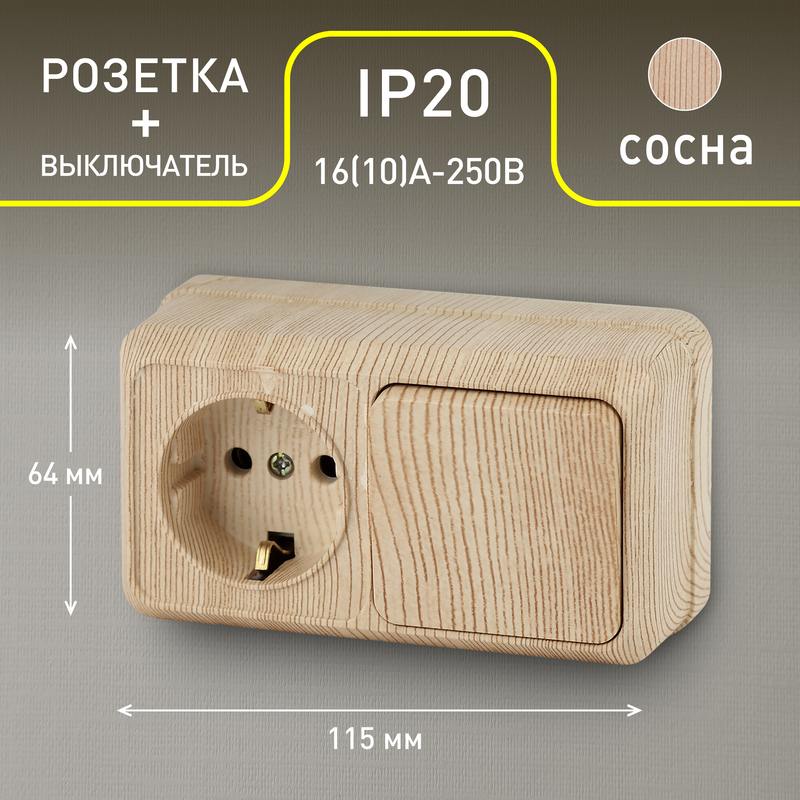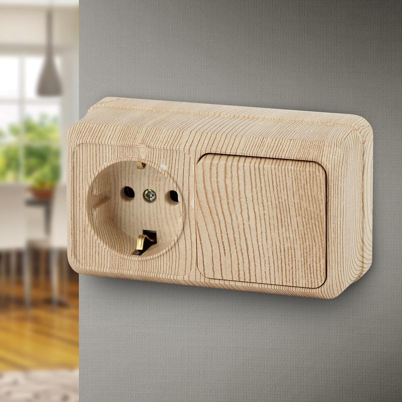 Блок розетка с выключателем Intro Quadro 2-701-11 одноклавишным горизонтальный 10(16)А-250В, IP20, ОУ, сосна