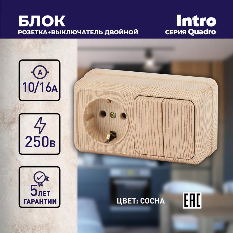 Характеристики Блок розетка с выключателем Intro Quadro 2-702-11 двойным горизонтальный 10А-250В, IP20, ОУ, сосна: