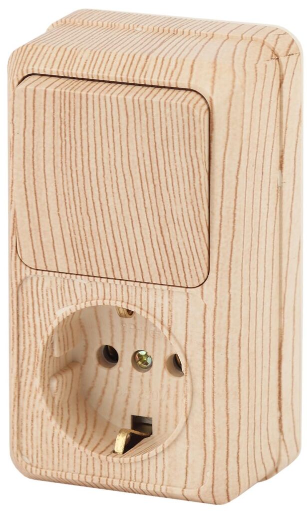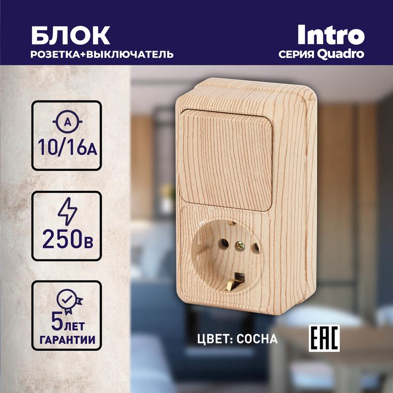 Характеристики Блок розетка с выключателем Intro Quadro 2-705-11 вертикальный 10А-250В, IP20, ОУ, сосна: