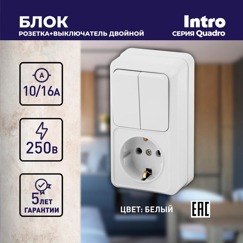 Характеристики Блок розетка с выключателем Intro Quadro 2-706-01 двойным вертикальный 10А-250В, IP20, ОУ, белый: