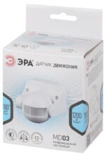 Характеристики Датчик движения ЭРА MD 03 для дома инфракрасный белый 1200 Вт угол 180 градусов 12 метров:
