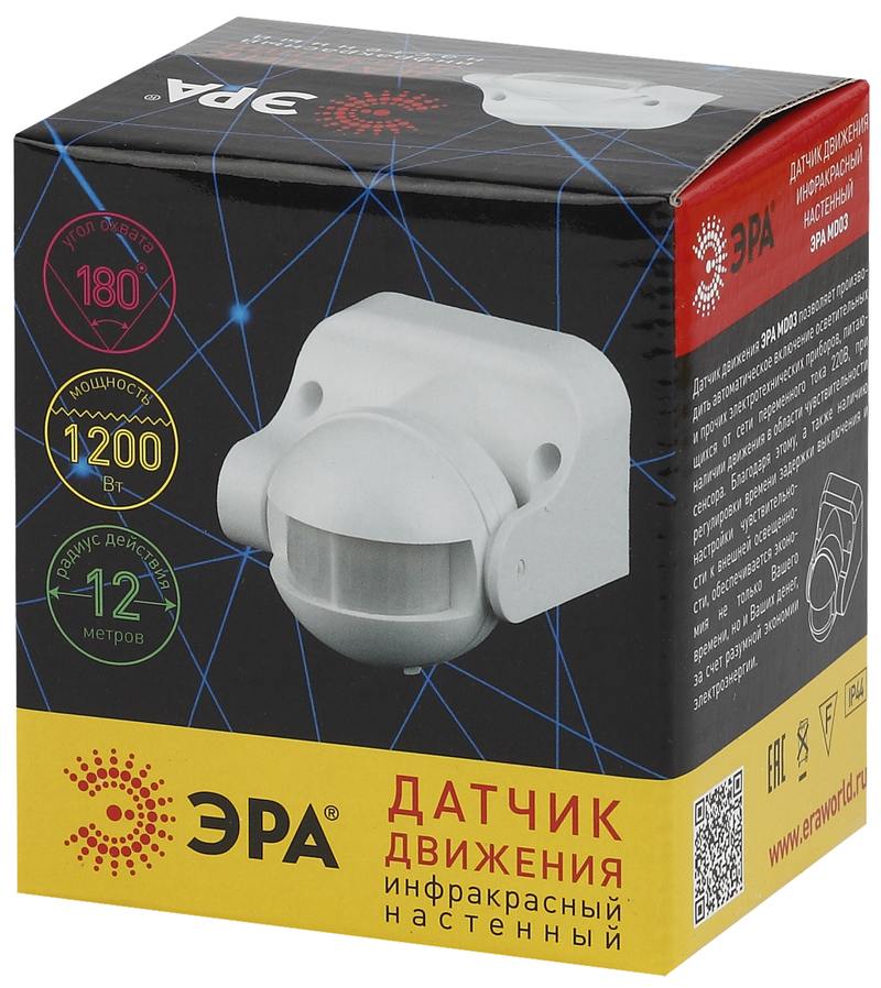 Характеристики Датчик движения ЭРА MD 03 настенный 1200Вт, IP-44, 12м: