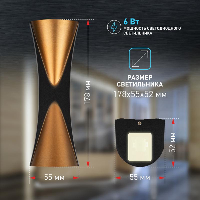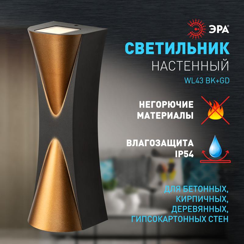 Характеристики Декоративная подсветка ЭРА WL43 BK+GD светодиодная 6Вт 3500К черный/золото IP54 для интерьера, фасадов зданий: