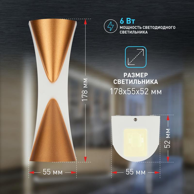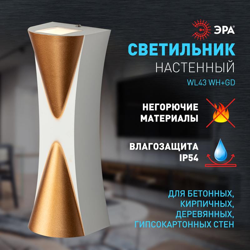 Характеристики Декоративная подсветка ЭРА WL43 WH+GD светодиодная 6Вт 3500К белый/золото IP54 для интерьера, фасадов зданий: