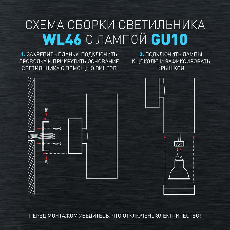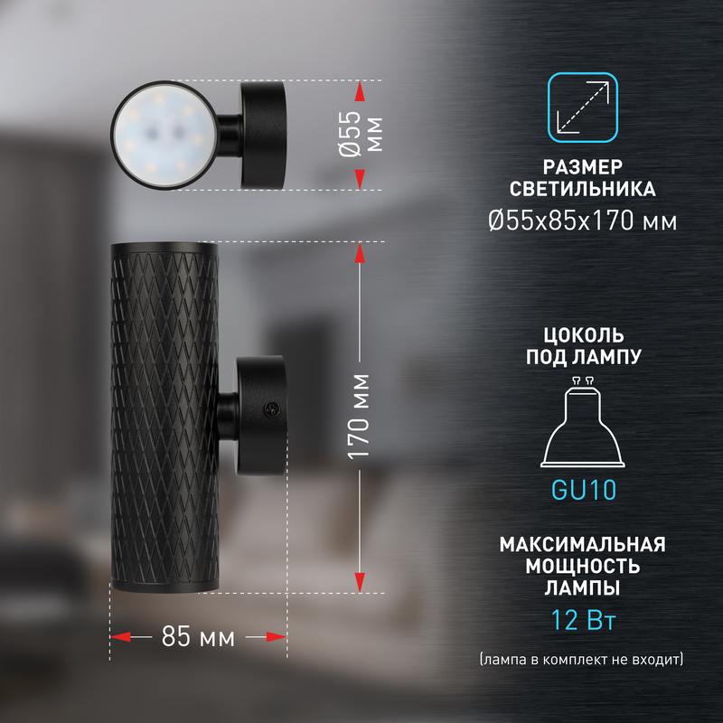 Светильник декоративный настенный WL46 BK предназначен для освещения гостиных, коридоров, спальных комнат. Создает интересные световые композиции, подчеркивает структуру материалов, формирует неожиданные эстетические эффекты. Цоколь для источника света GU10, напряжение питания ~230В 50/60Гц, материал металл, пластик, цвет светильника черный, размер D55х85×170мм, максимальная мощность лампы 12 Вт, степень защиты IP20