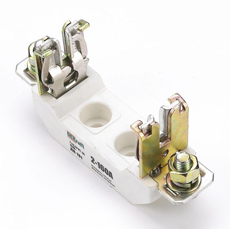 Держатель ножевого предохранителя серии ПН-101 DEKraft; тип 33; габарит 00; номинальный ток до 160 А. Предохранители ножевые применяются в однофазных и трехфазных сетях переменного тока, напряжением до 660 В, частотой 50 Гц. Держатель устойчив к механическим и термическим воздействиям, а также динамическим ударам при коротких замыканиях.