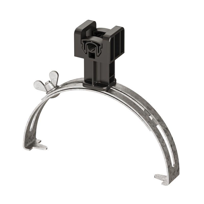 Регулируемый коньковый зажим с пластиковым держателем применяется для крепления молниеприемной сетки на круглом коньке кровли. Проводник фиксируется путем защелкивания. Диапазон зажима — 125-205 мм. Материал — горячеоцинкованная сталь.