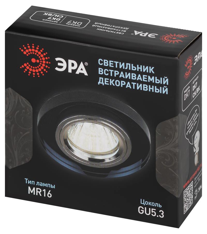 Характеристики DK7 CH/BK Светильник ЭРА декор стекло круглое MR16,12V/220V, 50W, хром/черный: